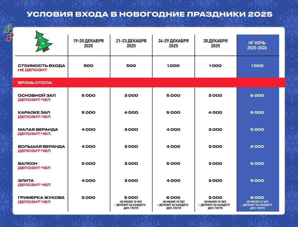 · бронь столов в залах: основной, балкон, караоке — депозит от 3 000р/человек.